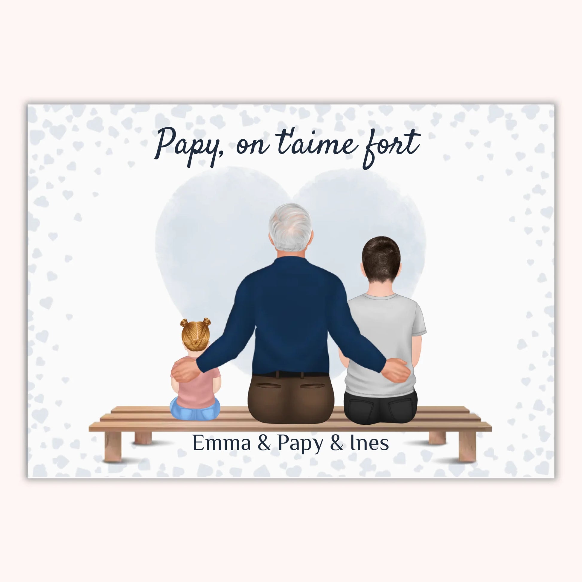 Vous cherchez cette affiche avec papy et mamie ? Découvrez notre affiche personnalisée papy mamie et petits-enfants, un design de la collection cadeaux personnalisés fête des grands-pères 💌